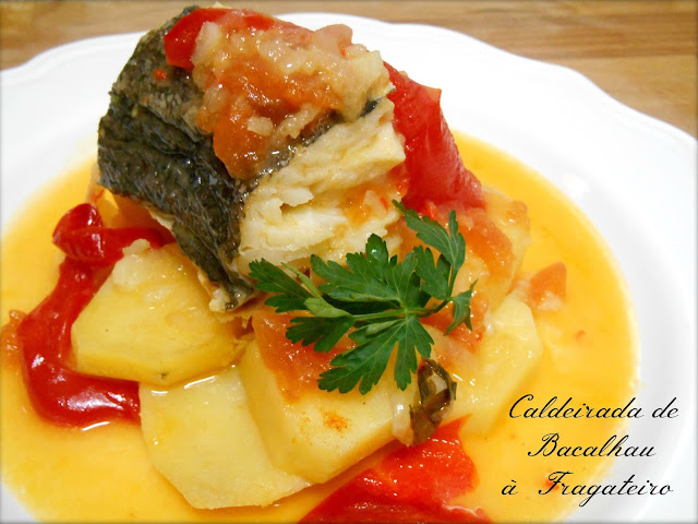 Numa panela adicionem por esta ordem, azeite (um fio generoso) cebola, alho e malagueta, salsa e 1 folha de louro, tomate e pimentos deixas refogar bem e adicionem uma camada de batatas, polvilhem com um pouco de colorau, a outra folha de louro, as postas de bacalhau cortadas ao meio e com a pele virada para cima, e mais uma camada de batatas polvilhadas por colorau. Temperem com sal, reguem com o vinho e se necessário acrescentem água para que tudo fique submerso. Tapem e deixem cozinhar em lume brando.