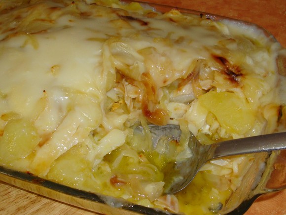 De seguida, cobre-se com uma camada de bacalhau, outra de ovo, outra de couve, outra de batata, e assim sucessivamente.