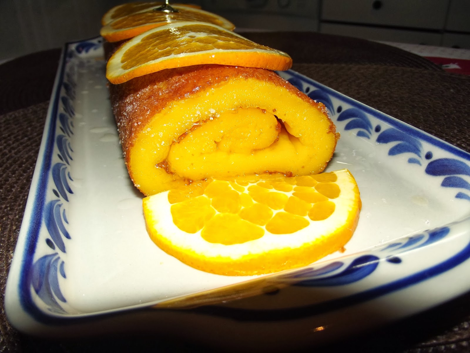 Coloque a torta num prato decorado com laranja cortada em meia-lua.