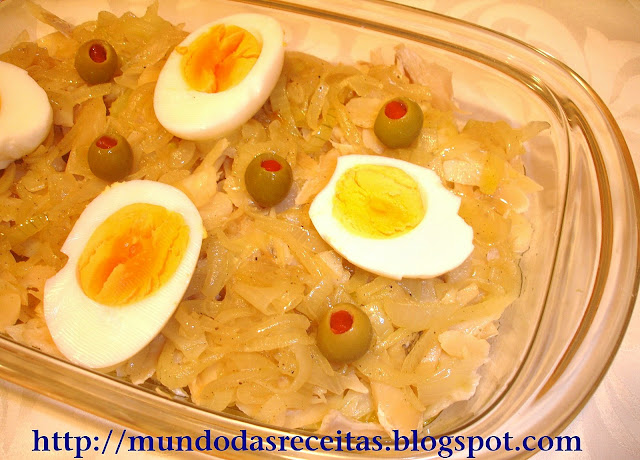 Cozem-se as postas de bacalhau, desfiam-se e reservam-se. Colocam-se a cozer as batatas. Escorrem-se e cortam-se às rodelas grossas. Reservam-se. Levam-se ao lume o azeite, a banha e a margarina. Juntam-se as cebolas cortadas às rodelas fininhas e o louro. Tempera-se com sal e pimenta.
