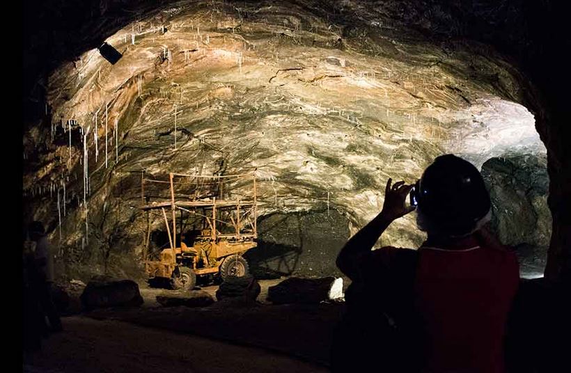 A viagem até ao interior da mina começa na jaula - um elevador montado na torre que foi construída no topo de um dos poços de acesso à mina. Daí até às profundezas da Terra demoram-se quatro minutos. Quatro minutos de obscuridade, apenas rompida pelos feixes das lanternas mineiras. Quando o elevador finalmente pára, estamos a 230 metros de profundidade.